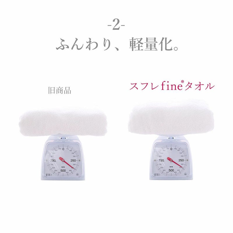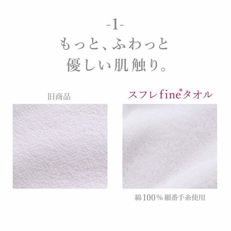 綿100%優しい肌触り+吸水速乾軽量+いやな毛羽落ちを低減した「スフレfineタオル」を開発。さらに着心地と使い勝手の良い商品に仕上げました。