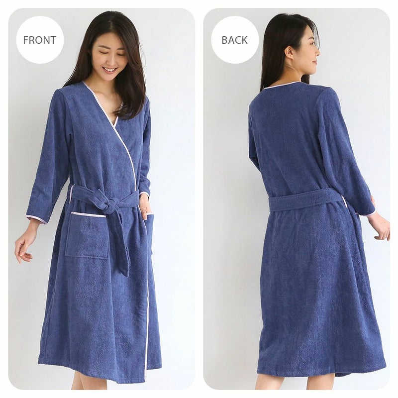 前合わせ、はだけ防止の内紐と太めのベルト付きです。ヘアブラシ等が入る大型のフロントポケットも便利です。
