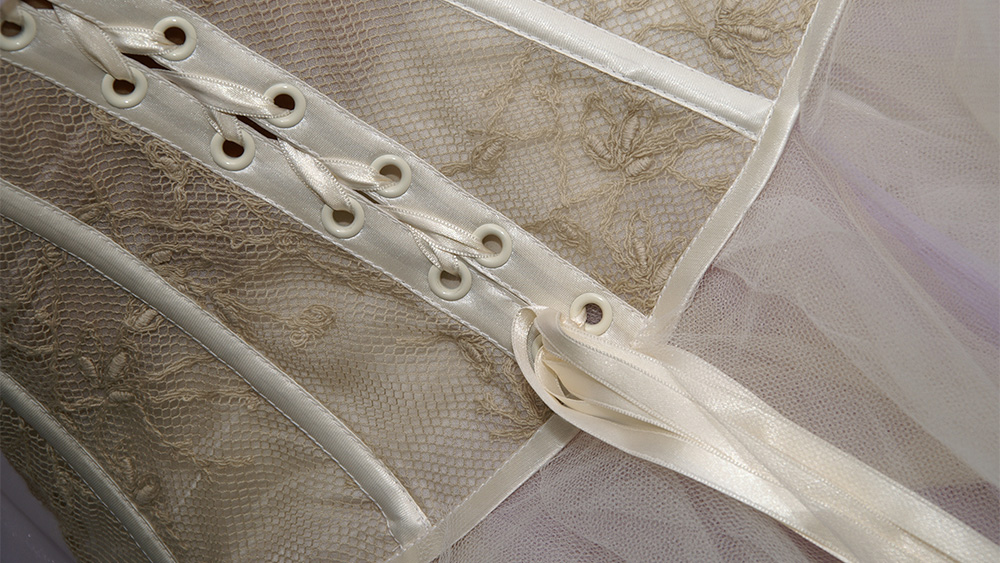 ビスチェは、ウェディングドレスのインナーとして定番ですね。肩紐がなくブラとウエストニッパーが一つになっています。