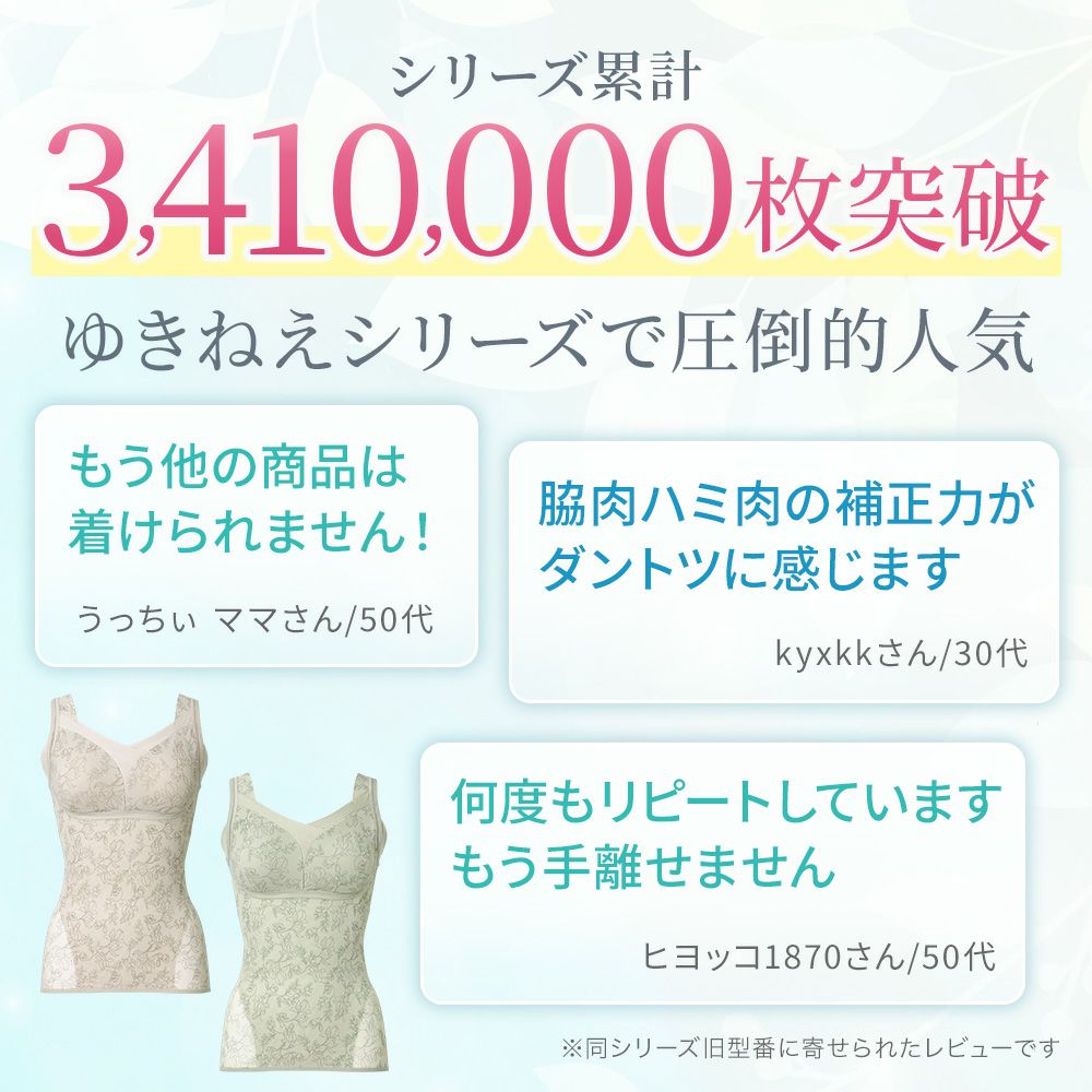 他の画像を見る ゆきねえモアソフト快適フルカップブラキャミ25 ノンワイヤー SALE 定価 ¥ 5,720 (税込) 当店価格 ¥ 5,060 税込 「Yukine inc.」のロングセラー、モアソフト快適シリーズ。伸縮性のあるパワーネットが、楽な着心地でボディラインを美しく整える補正ブラキャミです。 お気に入りに登録する