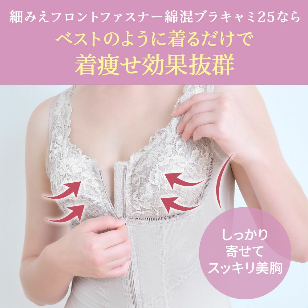 他の画像を見る 細みえフロントファスナー綿混ブラキャミ25 ノンワイヤー SALE 定価 ¥ 8,800 (税込) 当店価格 ¥ 6,050 税込 シリーズ初のブラキャミタイプが登場!!バストだけではなく、お腹や背中もすっきりシェイプし、細見え効果も期待できます お気に入りに登録する